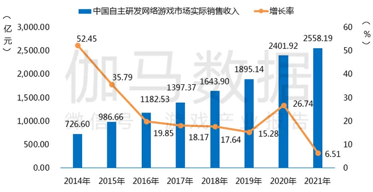 中国游戏自主研发国内市场,实际销售收入2558.19亿元 增长6.5%