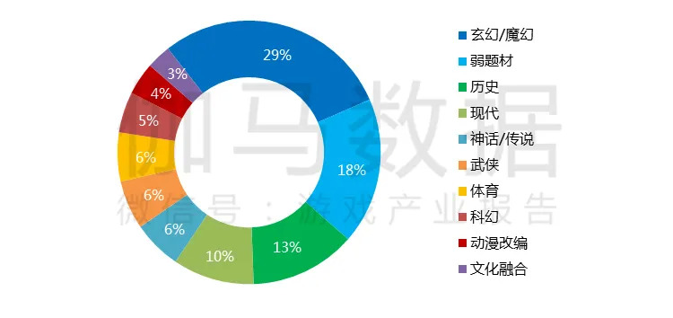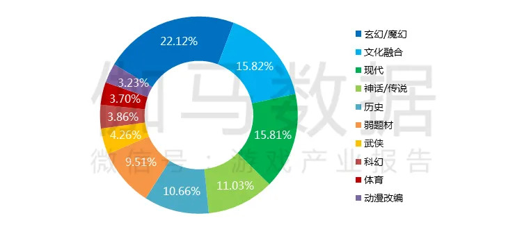 2021年,在中国移动游戏收入排名前100的产品中,在收入最高的前三题材类型分别是玄幻/魔幻题材、文化融合题材和现代题材,所占比例分别为22.12%、15.82%和15.81%。题材类型数量占比最高的三种类型的游戏分别是玄幻/魔幻、弱题材和历史游戏,占比分别是29%、18%和13%。玄幻/魔幻题材类游戏在流水收入和数量占比中都进入前三名。