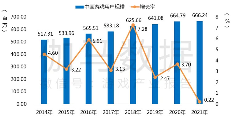 2021年,中国游戏用户规模保持稳定增长,用户规模达6.66亿人,同比增长0.22%。前几年,虽然用户增长缓慢,但是用户规模每年大多还是以千万级增长,而今年的增幅与2020年相比,用户规模变化不大,游戏人口的红利趋向于饱和,此外,虽然下半年的用户规模比上年呈现下降态势,主要是因为防沉迷新规落地,未成年人保护收获实效,用户结构趋向健康合理。
