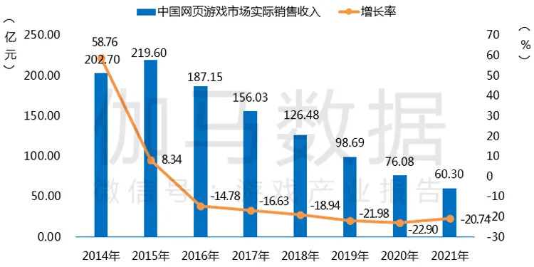 2021年,中国网页游戏市场实际销售收入仅为60.30亿元,比2020年减少了15.78亿元,同比下降20.74%,连续5年持续呈现下降的趋势。