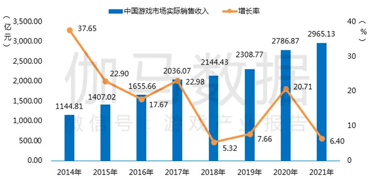 伽马数据(微信公众号:游戏产业报告)提供的数据显示:2021年,中国游戏市场实际销售收入2965.13亿元,比2020年增加了178.26亿元,同比增长6.40%。虽然实际销售收入依然保持增长态势,但是增幅比例较去年同比缩减近15%。