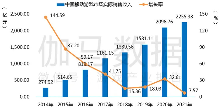 2021年,中国移动游戏市场实际销售收入2255.38亿元,比2020年增加了158.62亿元,同比增长7.57%。数据显示,移动游戏依然是我国游戏市场的主体,收入占比为76.06%。增幅较去年同比缩减25%。