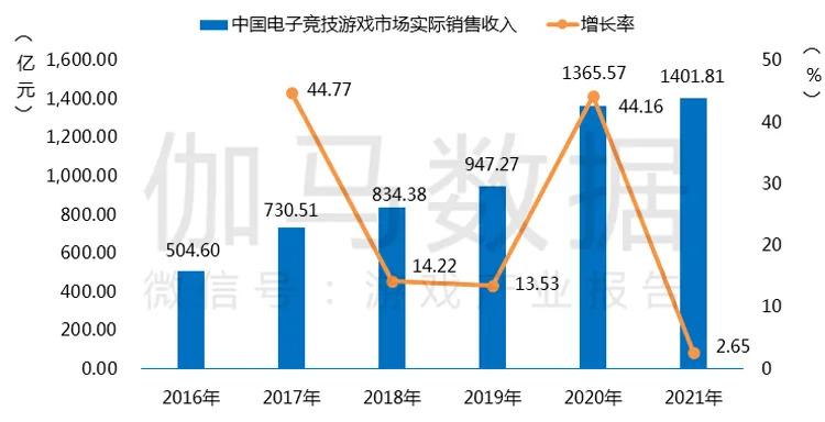 2021年,中国电子竞技游戏市场实际销售收入1401.81亿元,比2020年增加了36.24亿元,同比增长2.65%,增幅较去年同比缩减约42%,增速放缓。
