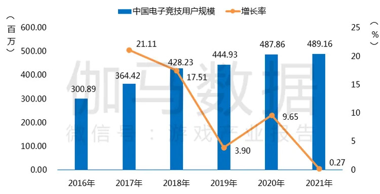 2021年,中国电子竞技游戏用户规模达4.89亿人,同比增长0.27%。虽然2021年电子竞技游戏用户规模增速放缓,但在电竞入亚和英雄联盟总决赛夺冠背景下,或带来明年新一轮增长。