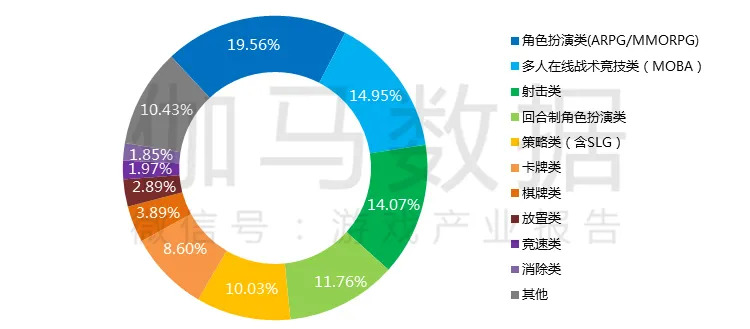 2021年,在中国移动游戏收入排名前100的产品中,角色扮演类游戏占比为19.56%;多人在线战术竞技类游戏占比为14.95%;射击类游戏仅次于多人在线战术竞技类游戏,占比为14.07%,三者占总收入的48.58%,占全部收入的近一半。这三类游戏的用户基数较大,进而总收入占比较高。