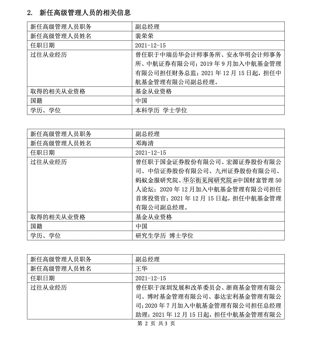 12月16日,中航基金发布公告称,裴荣荣、邓海清、王华新任公司副总,任职日期为12月15日。