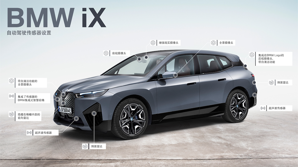 在传感器上,BMW iX全车配载5个摄像头、5个毫米波雷达,12个超声波雷达,总计22个传感器。