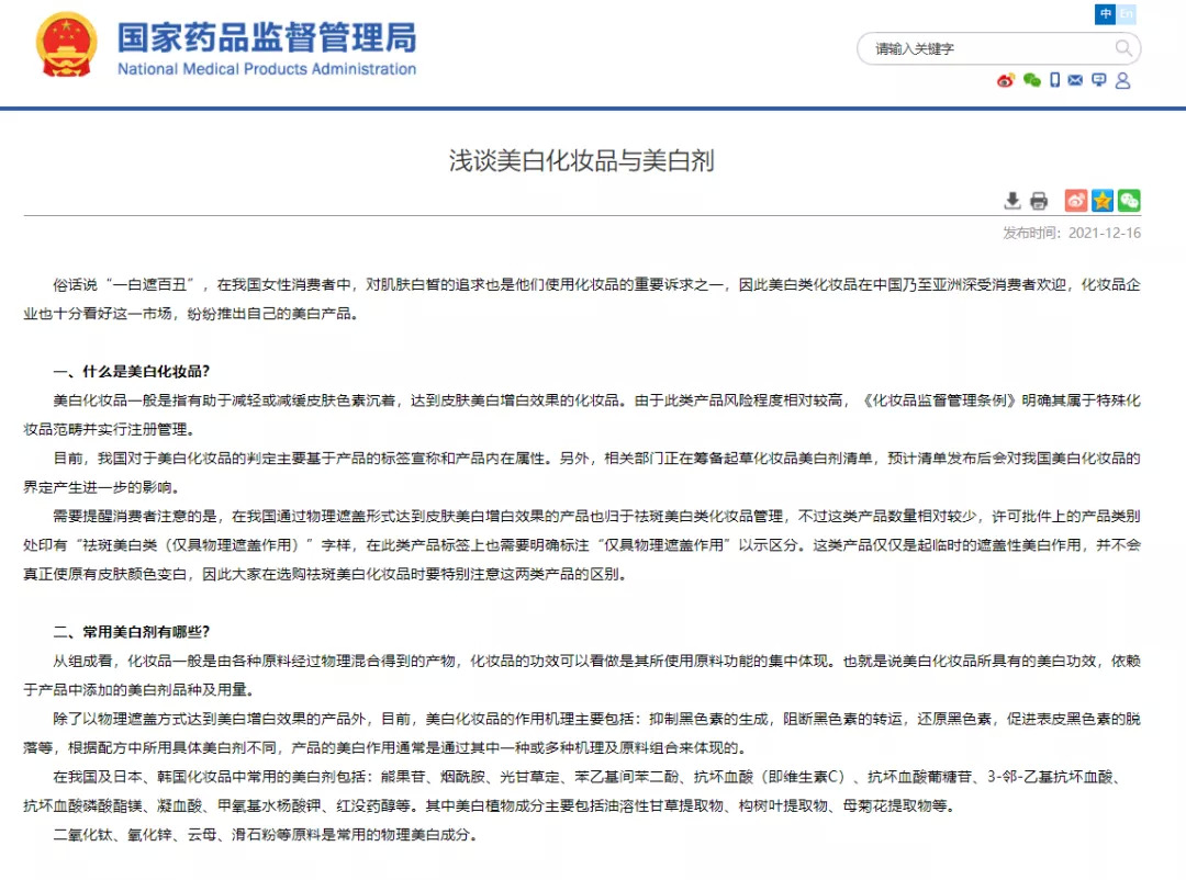 12月16日,国家药品监督管理局发布了一篇名为《浅谈美白化妆品与美白剂》的科普性文章,围绕美白化妆品的定性、安全风险、监管,以及苯乙基间苯二酚(俗称377)被禁用于普通化妆品的原因,进行了具体说明。