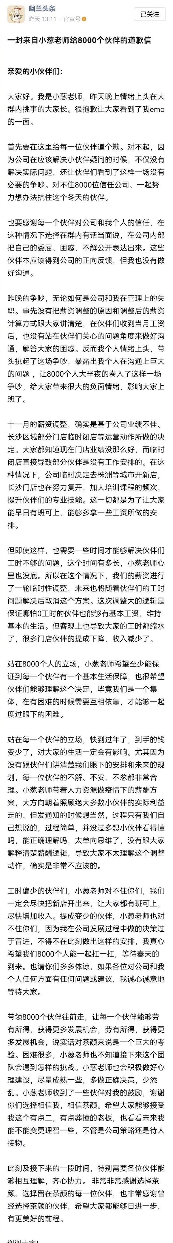 但眼下,对这家明星公司来说最重要的,或许是如何稳定人心,改善大本营的内部管理。有茶颜悦色员工仍在社交平台上表达对公司的理解,而那些想要拿多点钱过个好年的员工表达的,也不过是人之常情罢了。