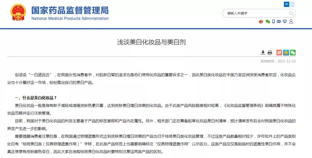 国家药监局今日发布的《浅谈美白化妆品与美白剂》一文,明确指出美白化妆品风险程度相对较高,属于特殊化妆品范畴并实行注册管理。在我国,美白化妆品既包括通过物理遮盖形式达到皮肤美白增白效果的产品,也包括可以真正改变肤色,让皮肤颜色变白的产品。