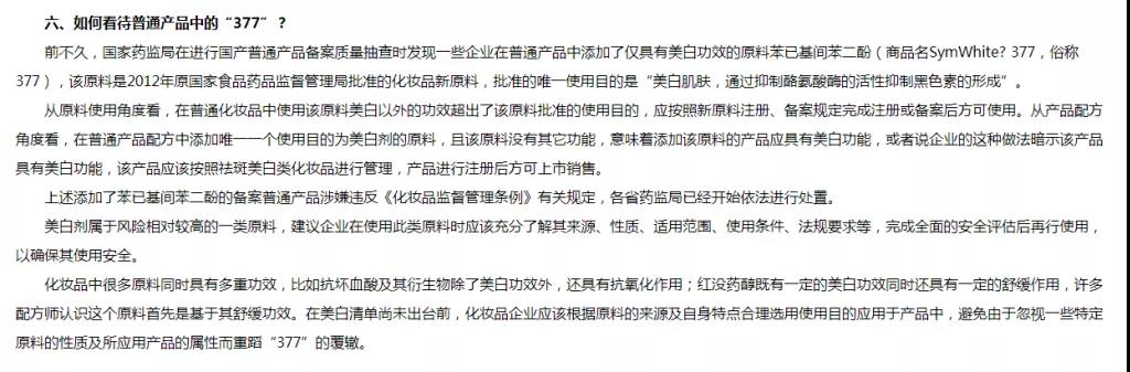 “红没药醇不会被禁用在普通化妆品中”“美白剂清单大概率不会有红没药醇”“说明红没药醇没事吧”,在业内看来,“377”是因为有着特殊性,使用目的具有唯一性,因此“377普通化妆品”是不合规的。今天国家药监局的文章,也强调了这一点,并且提到“苯乙基间苯二酚(俗称377)的备案普通产品涉嫌违反《化妆品监督管理条例》有关规定,各省药监局已经开始依法进行处置。”