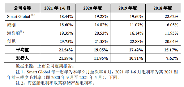 以江波龙在招股书中列举的同行业可比公司为例,Smart Global 、威刚、海盗船、创见四家企业在2018年-2020年的平均毛利率分别为15.17%、17.42%、19.05%,分别高出江波龙7.55%、6.71%、7.08%。