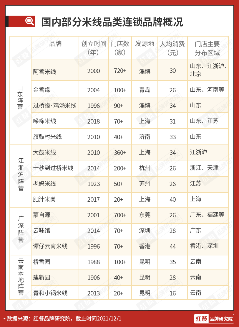 而米线经过几十年的发展,赛道早已涌现出一批优秀的连锁品牌,但知名度较高的头部品牌却大部分仍在深耕区域市场。从发源地与经营范围来看,全国米线市场隐隐呈现出“四分天下”的局势,大致可分为山东、江浙沪、华南、云南本地四大阵营。