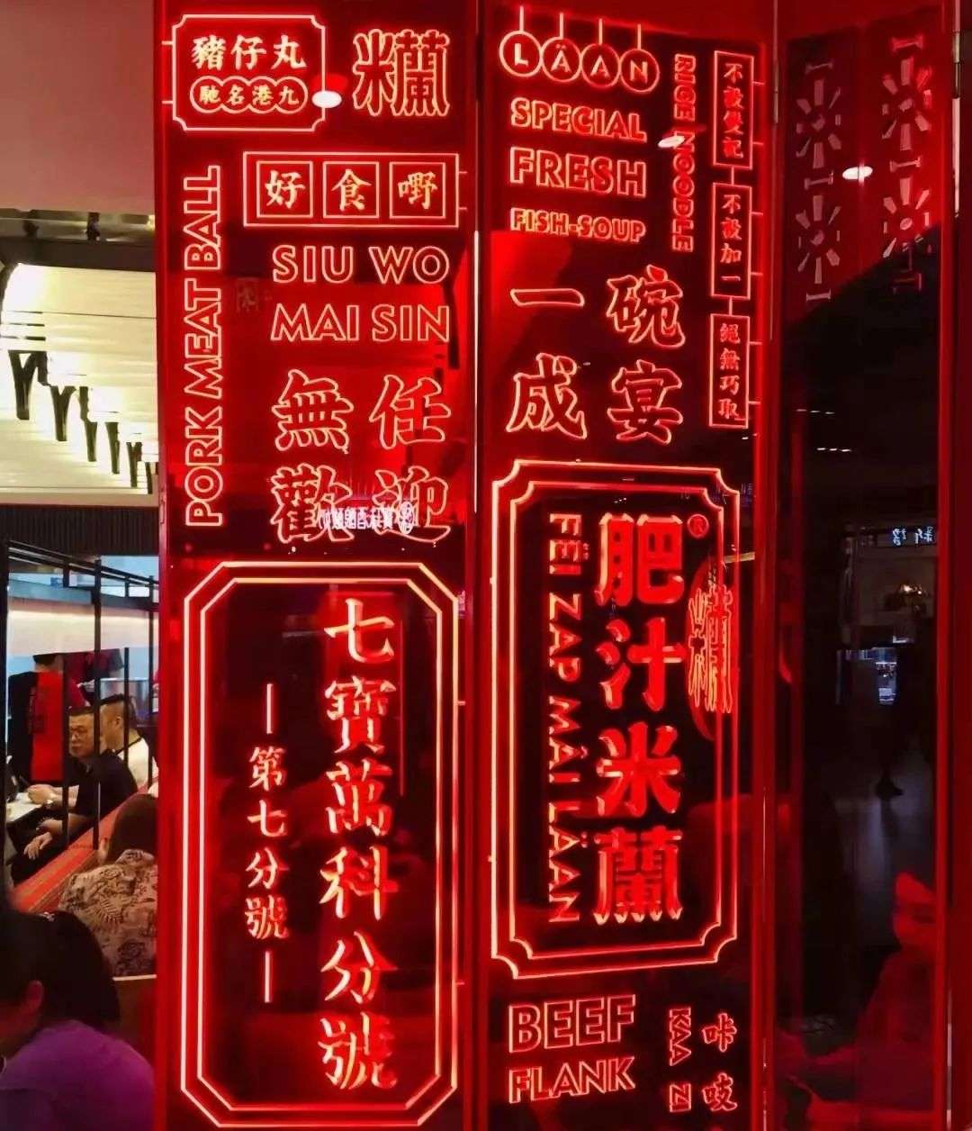 纵观肥汁米蘭的门店设计,复古港潮的设计特色显著,霓虹灯、发光屏风、蕾丝墙、复古路灯、机理花砖、格子布、城市风情图等元素的运用,将港风、港韵以一种新潮的形式演绎出来,也将肥汁米蘭与传统港式茶餐厅区别开来。