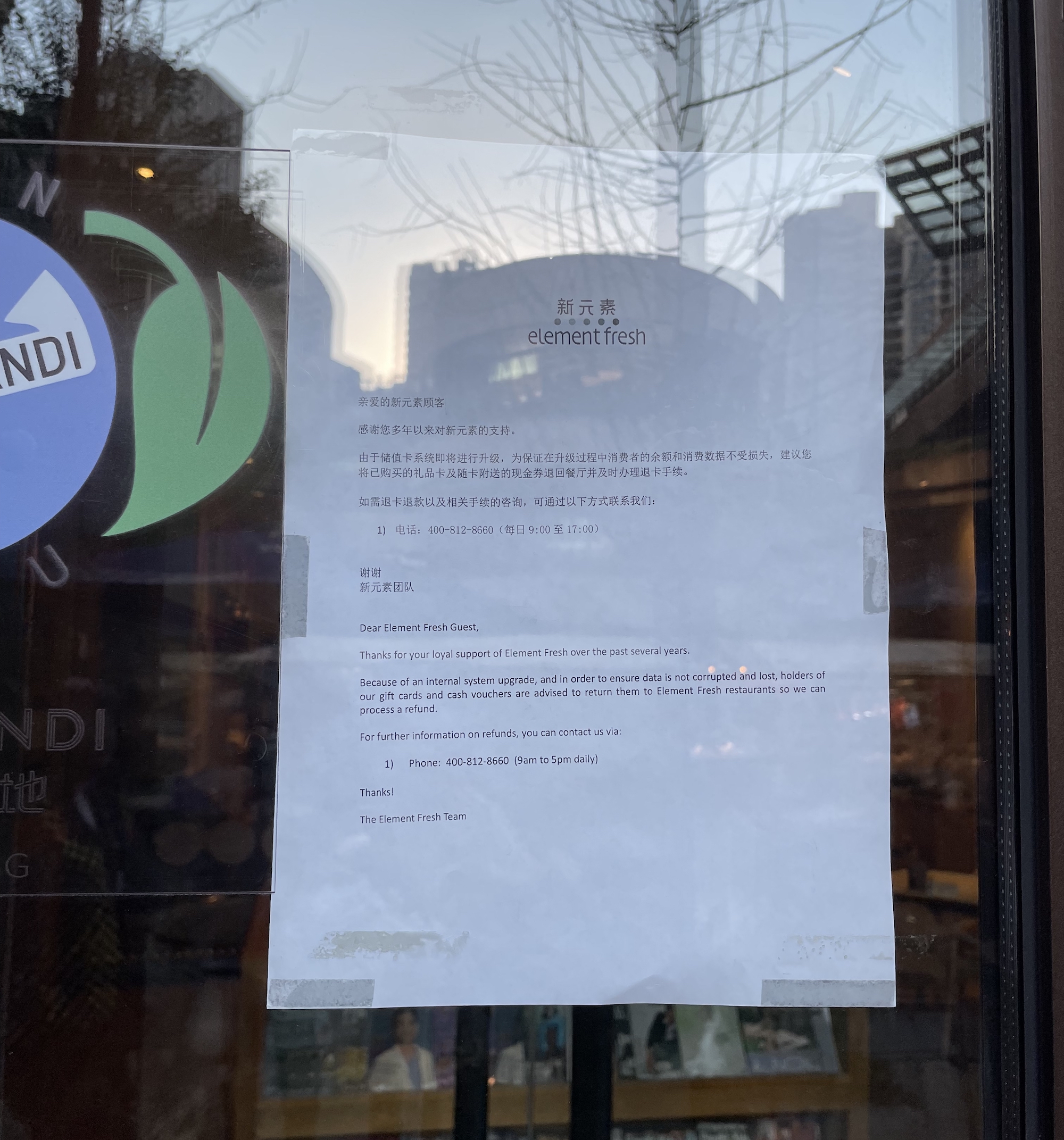 而界面新闻在上海瑞虹天地月亮湾门店探访时获知,门店即将在12月20日关闭,并贴出通知称“由于储值卡系统即将进行升级,为保证在升级过程中消费者的余额和消费数据不受损失,建议将已购买的礼品卡及随卡附送的现金券退回餐厅并及时办理退卡手续。”