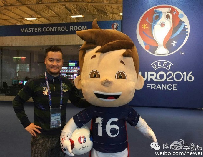 ▼欧洲杯国际转播中心,贺炜与吉祥物超级维克托合影