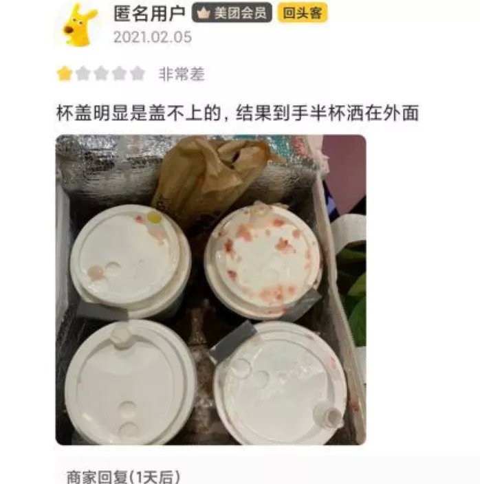 而分析成因,一种情况是门店订单量太多,员工打包时没有仔细检查;还有一种情况是杯身与杯盖紧密度不够高——在门店取餐情况下并不明显,但由于外卖过程中会颠簸,就很容易造成撒漏。