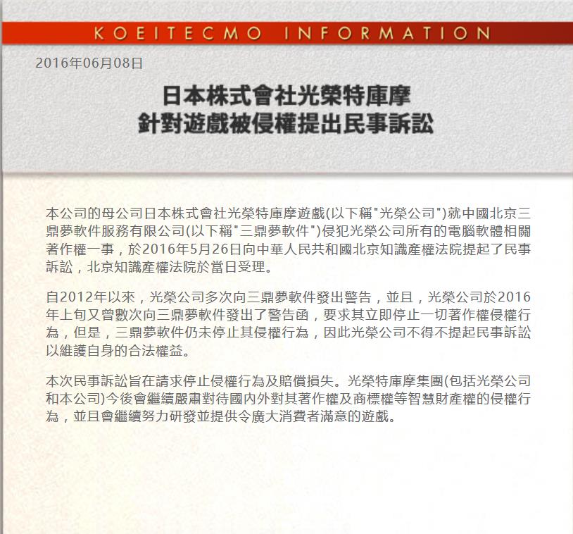 本次民事诉讼旨在请求停止侵权行为及赔偿损失。光荣特库摩集团(包括光荣公司和本公司)今后会继续严肃对待国内外对其著作权及商标权等知识产权的侵权行为,并且会继续努力研发并提供令广大消费者满意的游戏。