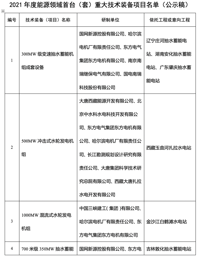 国家能源局网站12月22日消息,经组织专家评审和复核,国家能源局拟将“300MW级变速抽水蓄能机组成套设备”等76项技术装备列入2021年度能源领域首台(套)重大技术装备项目清单,现予以公示。公示时间为2021年12月22日至28日。