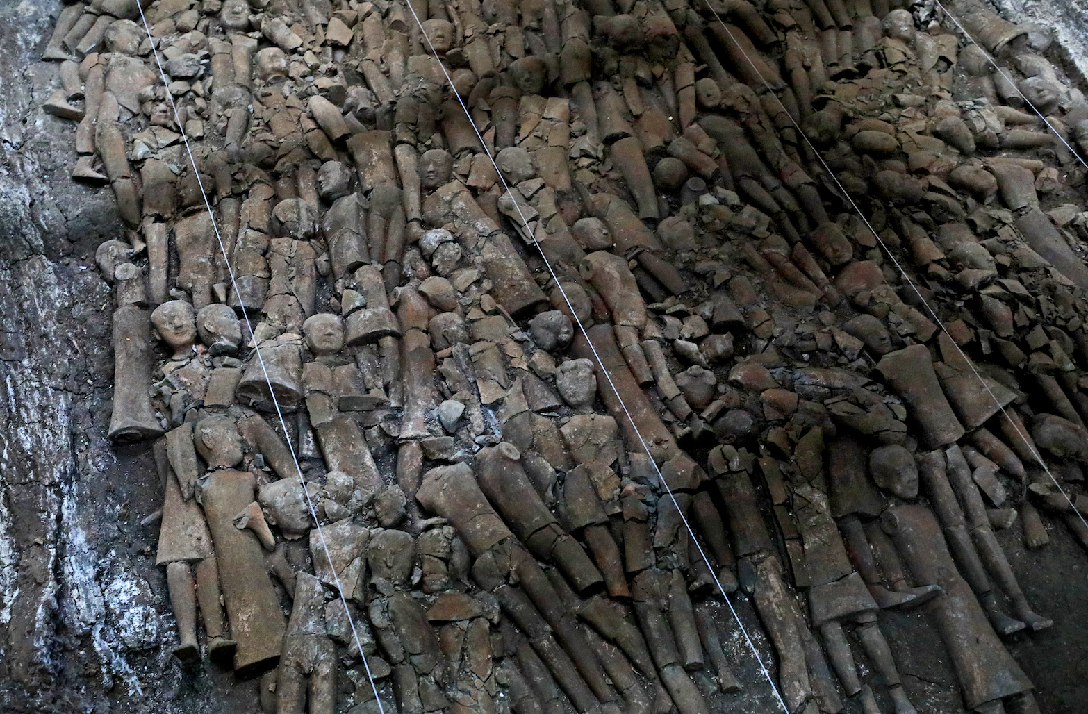 在江村大墓的四周,考古人员发现了115座外藏坑,这些外藏坑围绕着江村大墓呈放射状分布。经国家文物局批准,从2017年开始,考古人员对其中8座外藏坑进行了考古发掘,出土了着衣陶俑、陶器、铁器、铜器等大量汉代文物,同时还发现了“石围界”和门阙基址等陵园设施。他们在这些外藏坑中发现了明器官印,官印是官署权力的象征,其上文字为“车府”“中司空印”等。外藏坑围着江村大墓转一圈,相当于一百多个官署机构围绕墓葬分布。在接受央视采访时,陕西省考古研究院研究员马永赢表示:“一百多个官署机构围绕着中间的墓,所以这个墓主只能是皇帝。”