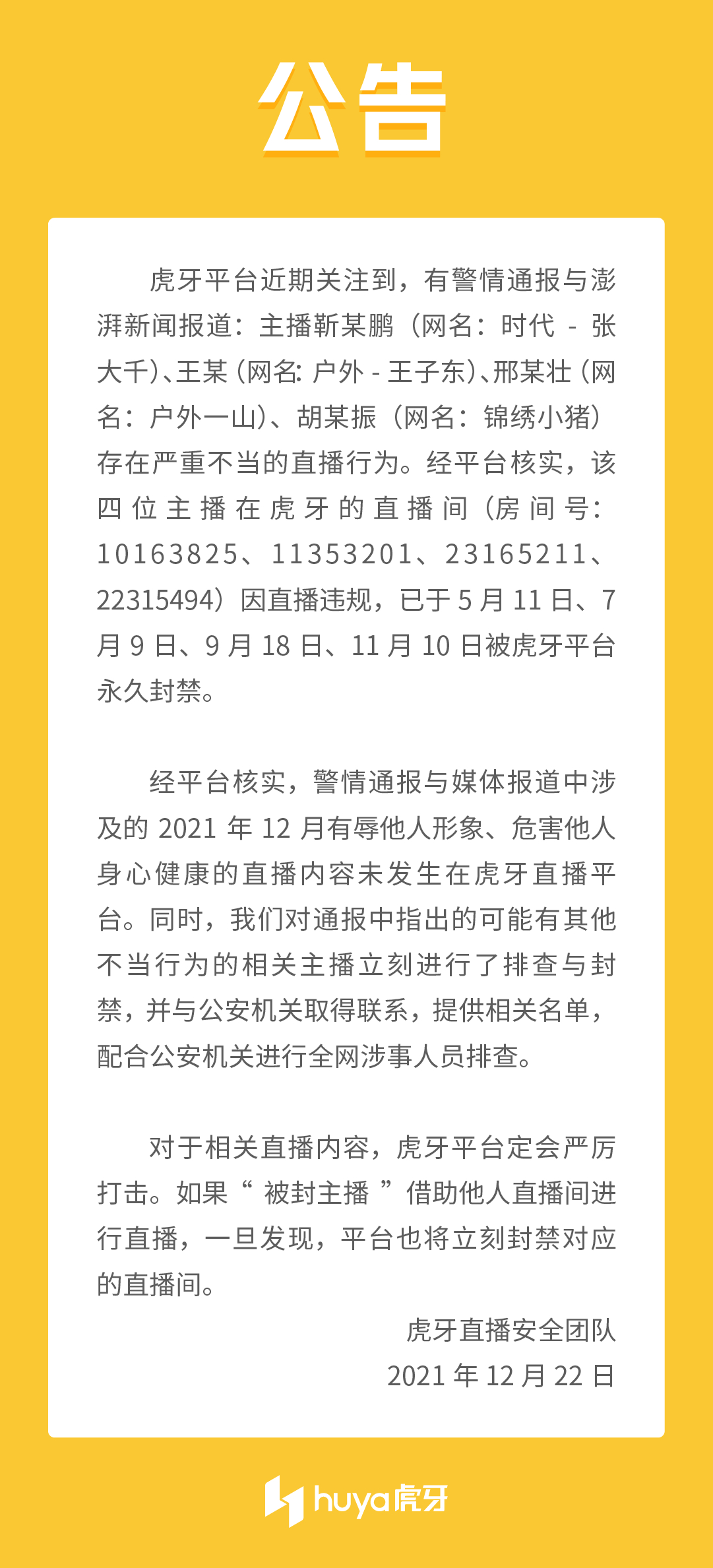 12月22日晚间,虎牙直播安全团队发布公告:虎牙平台近期关注到,有警情通报与澎湃新闻报道:主播靳某鹏(网名:时代一张大千)、王某(网名:户外-王子东)、邢某壮(网名:户外一山)、胡某振(网名:锦绣小猪)存在严重不当的直播行为。经平台核实,该四位主播在虎牙的直播间因直播违规,已于5月11日、7月9日、9月18日、11月10日被虎牙平台永久封禁。