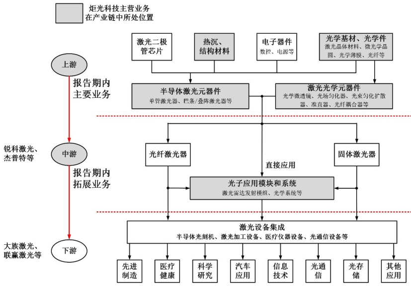 炬光科技目前业务处于激光产业链的上游和中游。在激光产业链上游覆盖了半导体激光元器件和激光光学元器件,中游则覆盖了包括激光雷达发射模组在内的光子应用模块和系统。