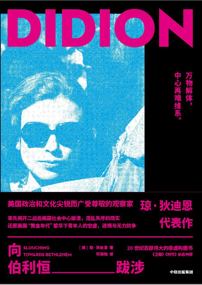 1934年,狄迪恩出生于加利福尼亚州的萨克拉门托市。从大学毕业到探索新闻写作之前,她曾在《VOGUE》杂志工作多年,其早期所写的散文和电影批评已经显露出一种带着伤感情绪的独特腔调,但到了60年代,她已经完全厌倦了这类题材。于是,当《星期六晚邮报》同意狄迪恩参与实地报道时,她立刻抓住机会,将目光投向了自己最熟悉的加利福尼亚州。从报道犯罪事件到记录嬉皮士运动,狄迪恩写下了一系列揭示二战后美国繁荣表象下失序现实的作品,一度掀起现象级的热议,这些文章后被收录于《向伯利恒跋涉》一书。