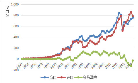 图1日本贸易盈余的趋势(1950-2015)