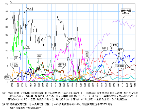 图2:日本主要出口产品长期趋势-出口总额占比(1886-2015)