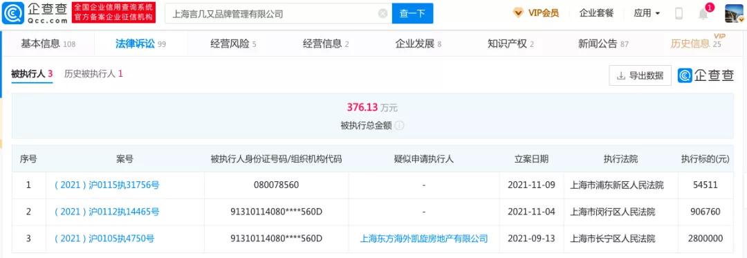 值得注意的是,言几又关联公司四川言几又文化传播有限公司今年已两次被列入“被执行人”,上海言几又品牌管理有限公司、江苏言几又文化传播有限公司已有多条限制消费令,上海言几又品牌管理有限公司被执行总金额已达376.13万元。