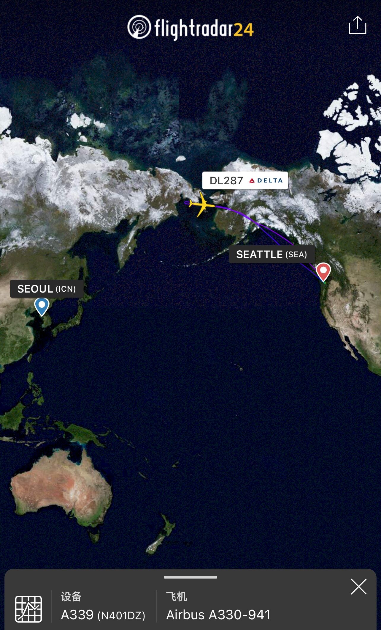 据全球实时航班数据平台Flightradar24显示,当地时间12月21日,DL287次航班原计划晚上10:59分从西雅图塔科马国际机场起飞,第二天早上3:50分抵达首尔仁川国际机场。