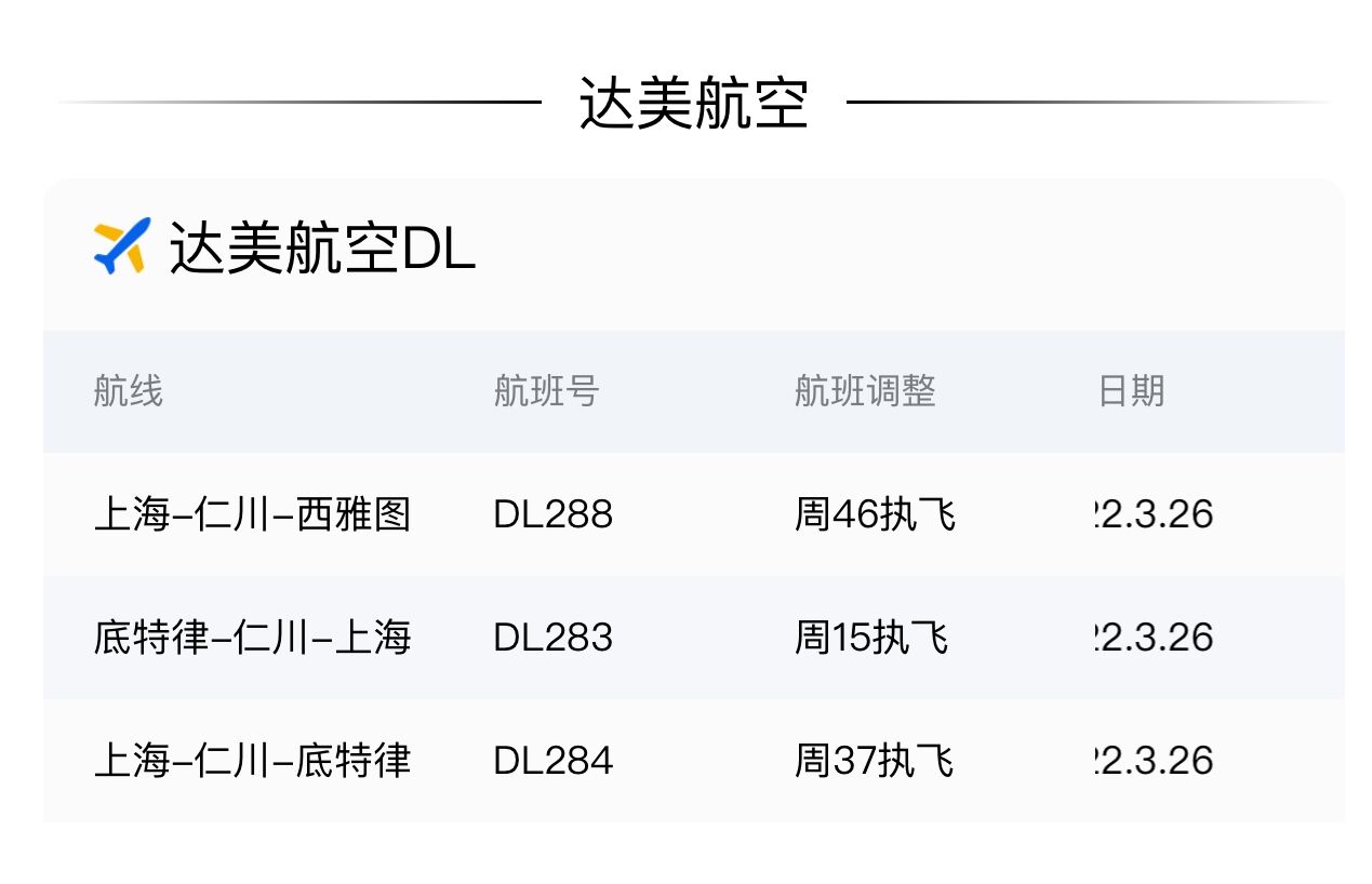 其中,达美航空上海-仁川-西雅图航班,每周四、周六执飞,与此同时,达美航空每周一、周五执飞底特律-仁川-上海航班,每周三、周日执飞上海-仁川-底特律返程航班。