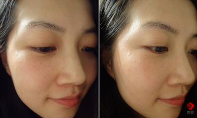 Point3:按照"两颊→T字部→鼻窝→眼角"的顺序,将妆前乳由中心向外侧轻轻推匀,这样可以使脸部中间为中心焕发出明亮立体的感觉。