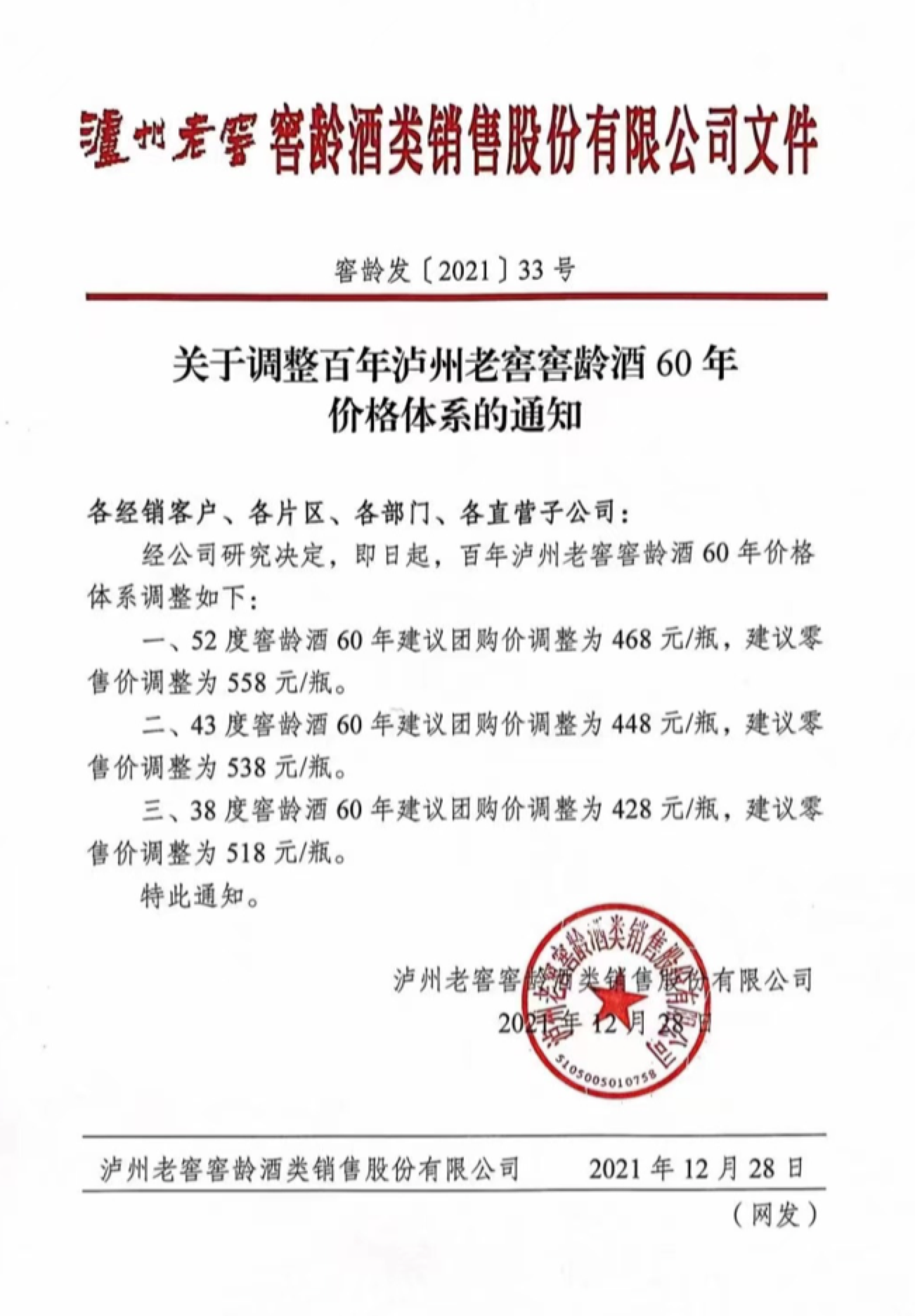 据财联社,即日起,泸州老窖上调百年泸州老窖窖龄酒60年(52度、43度和38度)的建议团购价和零售价。(财联社记者 陈默 熊嘉楠)