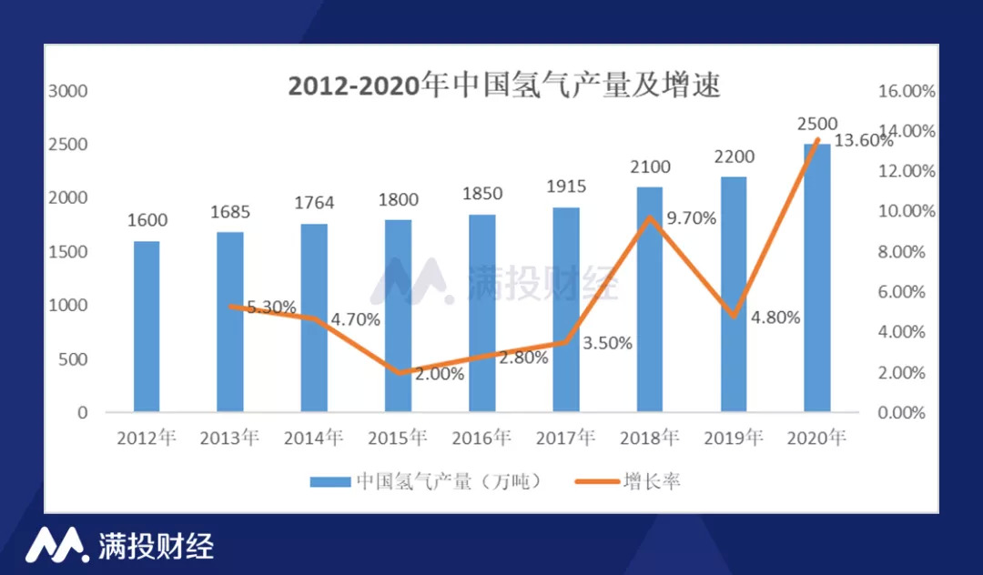 中国是第一产氢大国,氢能的生产利用已经非常广泛,自2009年产量首次突破1000万吨以来,已经连续9年保持世界第一,且整体呈稳步增长趋势。2020年全国氢气产量约为2500万吨,约占全球产量的三分之一,同比增长13.6%,但主要是作为工业原料使用而非能源。如果中国未来大力发展氢能产业将具备较好的基础。