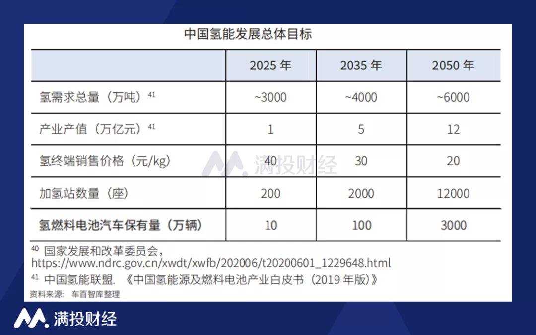 氢能将作为中国清洁高效能源生产和消费体系的重要构成部分,根据《中国氢能源及燃料电池产业白皮书(2019年版)》对中国氢能发展总体目标作出的规划,到2050年,氢能在交通运输、储能、工业、建筑等领域广泛使用,氢需求量将由目前的2000多万吨提升至约6000万吨,氢能产业链价值将超过10万亿元。到2050年氢的终端销售价格降至20元/kg,加氢站数量将达到12000座,氢燃料电池汽车保有量达到3000万辆。