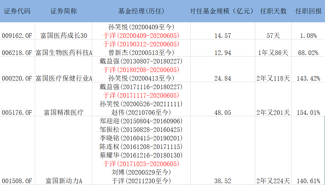 Wind数据显示,于洋在任期间,共管理了富国医药成长30、富国生物医药科技、富国医疗保健行业、富国精准医疗、富国新动力等多只基金,管理规模共计138.92亿元。其中,富国医药成长30成立于2020年4月9日,而刘洋在新基金成立后的两个月后就提出了辞职。
