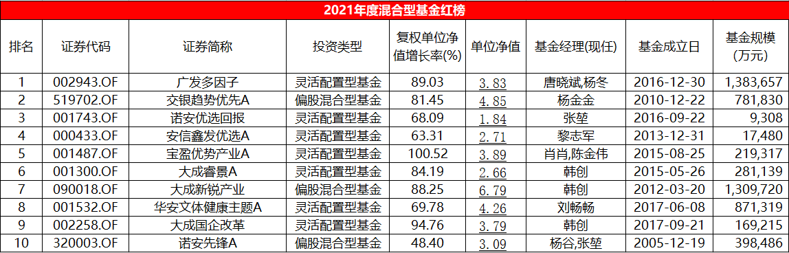Wind数据显示,纳入统计的混合型基金(偏股混合、平衡混合、灵活配置)共计3914只,2021年平均收益率为10.2%。其中,崔宸龙管理的前海开源新经济年度收益率为109.36%,肖肖、陈金伟管理的宝盈优势产业收益率为100.52%,成为市面上唯二的翻倍基金。