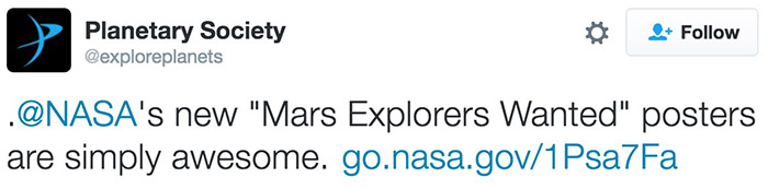 随着川普人气日益飙升,美国人民移民的心情越发迫切起来。太空界最好的营销团队NASA最近就发布了一波号召大家移民火星的海报,你可以在NASA官网上免费下载到这些30X48英寸的80年代风格海报,并打印出来贴在墙上。