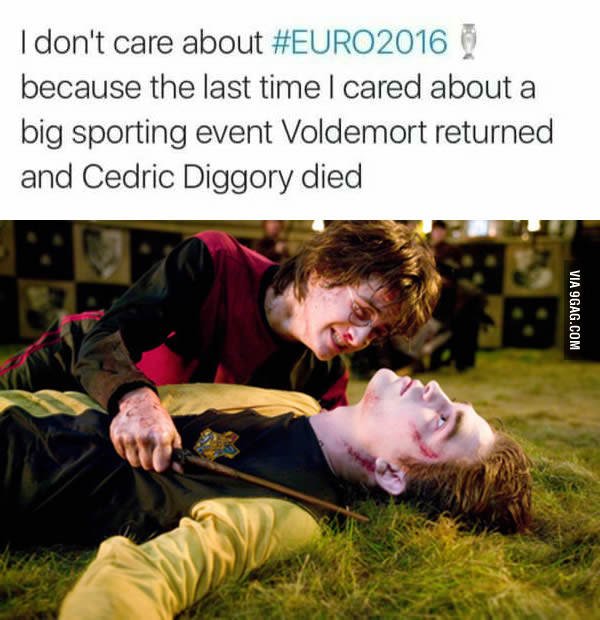 欧洲杯小组赛第一轮已经战毕,不看球的你完全不知道大家都在开心什么,下次遇到有旁友问你为什么不看欧洲杯,你可以这样说:“我不关心欧洲杯,因为上一次我关注一场大型体育赛事的后果,是伏地魔回来而德里克·迪戈里死掉了。”