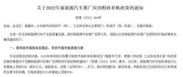 另外,除了2022年,新能源汽车补贴标准在2021年基础上退坡30%外;城市公交、道路客运、出租(含网约车)、环卫、城市物流配送、邮政快递、民航机场以及党政机关公务领域符合要求的新能源车辆,补贴标准在2021年基础上退坡20%。