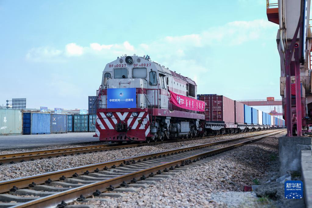 2021年10月29日,首班“中欧班列—进博号”列车抵达上海。当日,首班“中欧班列—进博号”到达上海,从德国汉堡出发的该趟班列上装载了智能真空喷射冲洗系统、电机零件等第四届中国国际进口博览会参展展品,这也是进博会展品首次坐中欧班列直达上海。新华社记者 丁汀 摄