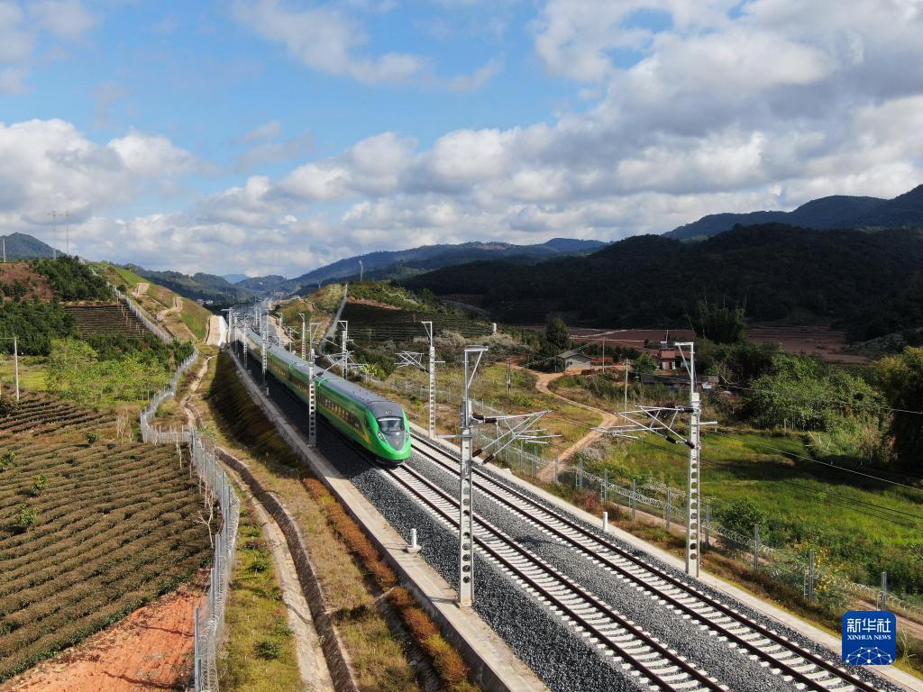 2022年1月3日,列车行驶在位于云南西双版纳傣族自治州景洪市境内的中老铁路上(无人机照片)。新华社发(李云生摄)