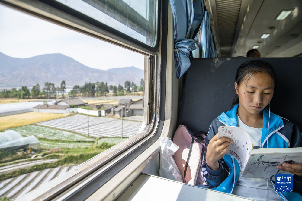 2021年4月15日,一名喜德县瓦尔学校的学生乘坐5634次列车回家。5633/5634次列车被人们亲切地称为“慢火车”,陪伴着四川大凉山地区几代人的成长,是百姓外出的“公交列车”,也是孩子们求学的“校车”。新华社记者 沈伯韩摄