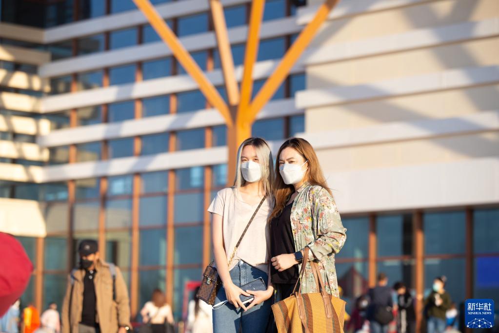 2021年12月12日,旅客在中老铁路万象站广场拍照。新华社记者 章建华 摄