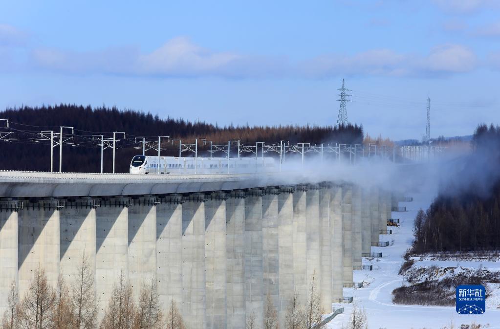 试运行期间,高铁列车行驶在沈佳高铁白敦段上(2021年12月3日摄,无人机照片)。2021年12月24日,沈阳至佳木斯高铁长白山至敦化段正式开通运营,长白山风景区接入全国高铁网,长春至长白山最快2小时18分可达。沈佳高铁白敦段位于吉林省延边朝鲜族自治州境内,设计时速250公里,由于其穿越原始森林,被誉为“森林高铁”。新华社发(刘慎库 摄)