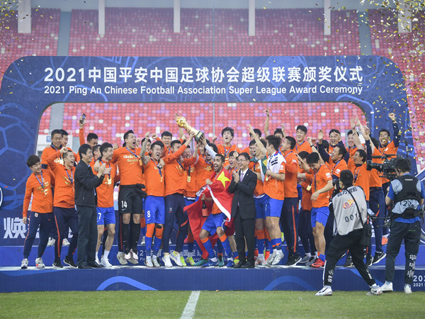 1月4日,2021中国平安中超联赛在广州正式闭幕,山东泰山时隔11年再次夺冠。2021年,新冠疫情带来的影响仍在持续,作为中超联赛连续八年的官方冠名商,中国平安在保险保障、医疗服务和科技领域积极合作,保证联赛平安、有序进行。颁奖仪式上,中国足球协会主席陈戌源与中国平安董事会秘书兼品牌总监盛瑞生一同为山东泰山队颁发火神杯。
