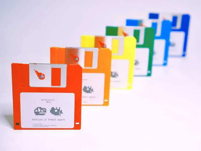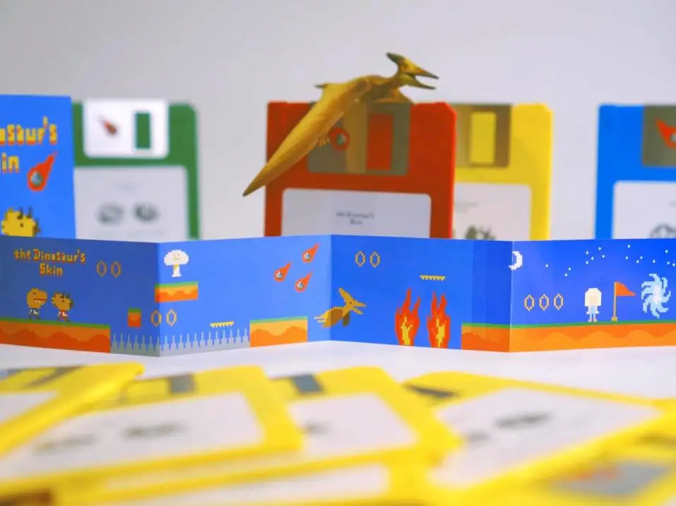 我对装帧设计没有太多研究及关注,在有限的观察范围内,我觉得“恐龙的皮”的首张EP用3.5寸软盘作为载体,是挺新鲜有趣的操作。“恐龙的皮”是一组宣称由两只恐龙组成的音乐团体,两位成员在公开场合都戴着恐龙头套面对观众。对上古生物“恐龙”而言,软盘是新鲜的高科技,对当下人类而言,软盘却是几乎绝迹的产品,这种反差挺有趣。