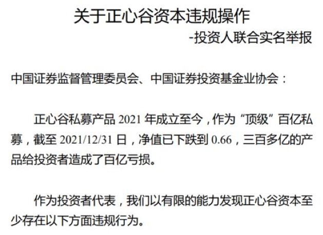 举报信中,投资人直指正心谷多项问题。其中有一段话显示:“作为顶级百亿私募,截至2021年底,净值已下跌到0.66元,三百多亿元的产品给投资者造成了百亿元亏损。作为投资者代表,我们以有限的能力发现正心谷资本至少存在虚假宣传、敷衍拖延、风控缺失等违规行为。”
