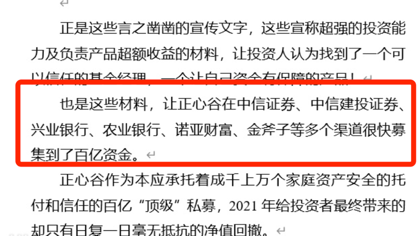 投资人还举报称,因存在虚假宣传等,正心谷在中信证券、中信建投证券、兴业银行、农业银行、诺亚财富、金斧子等多个渠道很快募集到了百亿资金。正心谷作为本应承托着成千上万个家庭资产安全的托付和信任的百亿“顶级”私募,但2021年给投资者最终带来的却只有日复一日毫无抵抗的净值回撤。